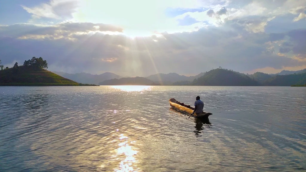 - Rudere in einem hölzernen Dugout-Kanu über den Lake Mutanda (Nachmittagsaktivität)